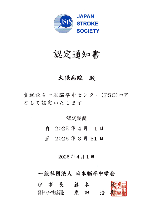 大隈病院は、一般社団法人脳卒中学会認定の「一次脳卒中センター(PSC:Primary Stroke Center)コア施設として登録されました。