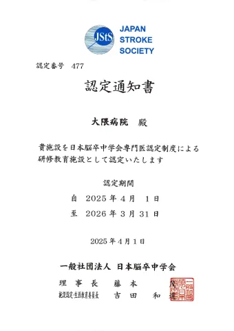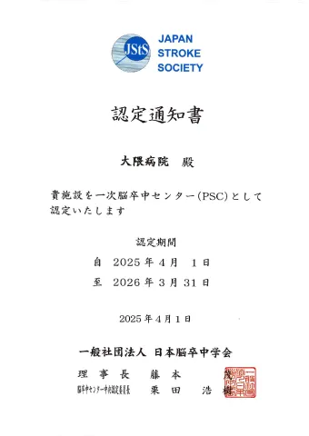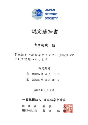 この度、当院は日本脳卒中学会から「一次脳卒中センター(PSC)コア」施設に認定されました。